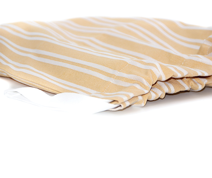 Tela “Batea”: Jacquard 100% poliéster. Listón ajustable: cinta palmita 100% algodón. Medidas: 30 cm x 38 cm.