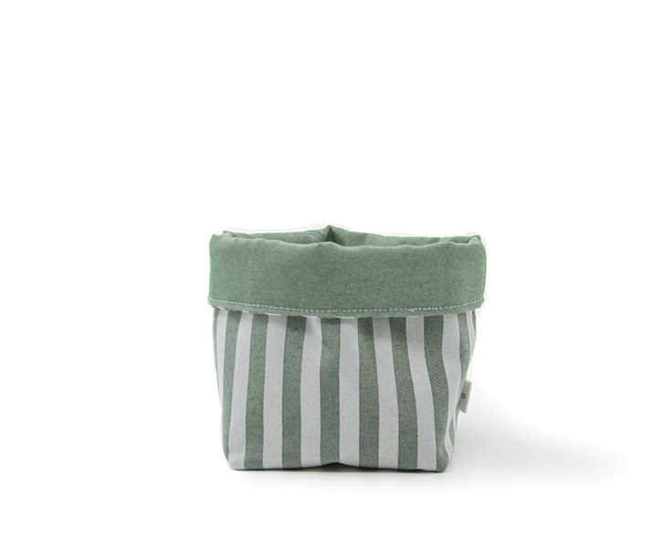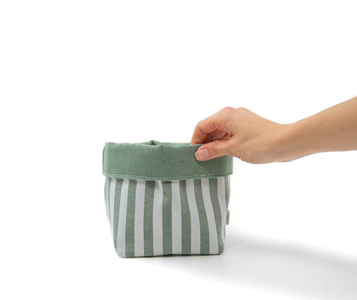 18 cms H, 16 Diámetro. Interior & exterior de tela “Batea” Jacquard 100% Poliéster, relleno de Pellón 100% Poliéster.