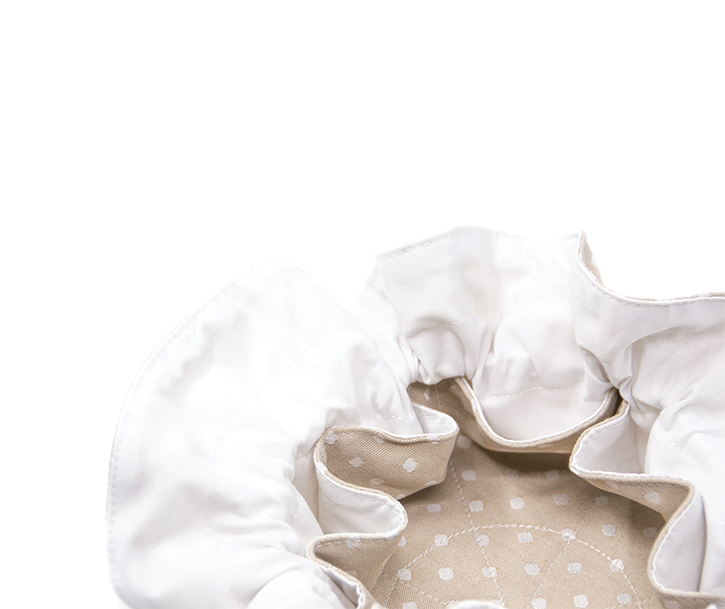 Tela exterior e interior “Batea”: Jacquard 100% poliéster. Compartimentos: popelina 100% algodón. Listón ajustable: cinta palmita 100% algodón. Medidas: 26 cm diámetro (extendido), 10 cm diámetro (cerrado).