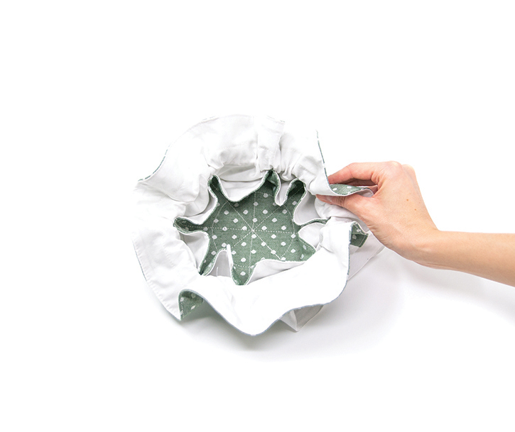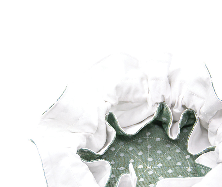Tela exterior e interior “Batea”: Jacquard 100% poliéster. Compartimentos: popelina 100% algodón. Listón ajustable: cinta palmita 100% algodón. Medidas: 26 cm diámetro (extendido), 10 cm diámetro (cerrado).