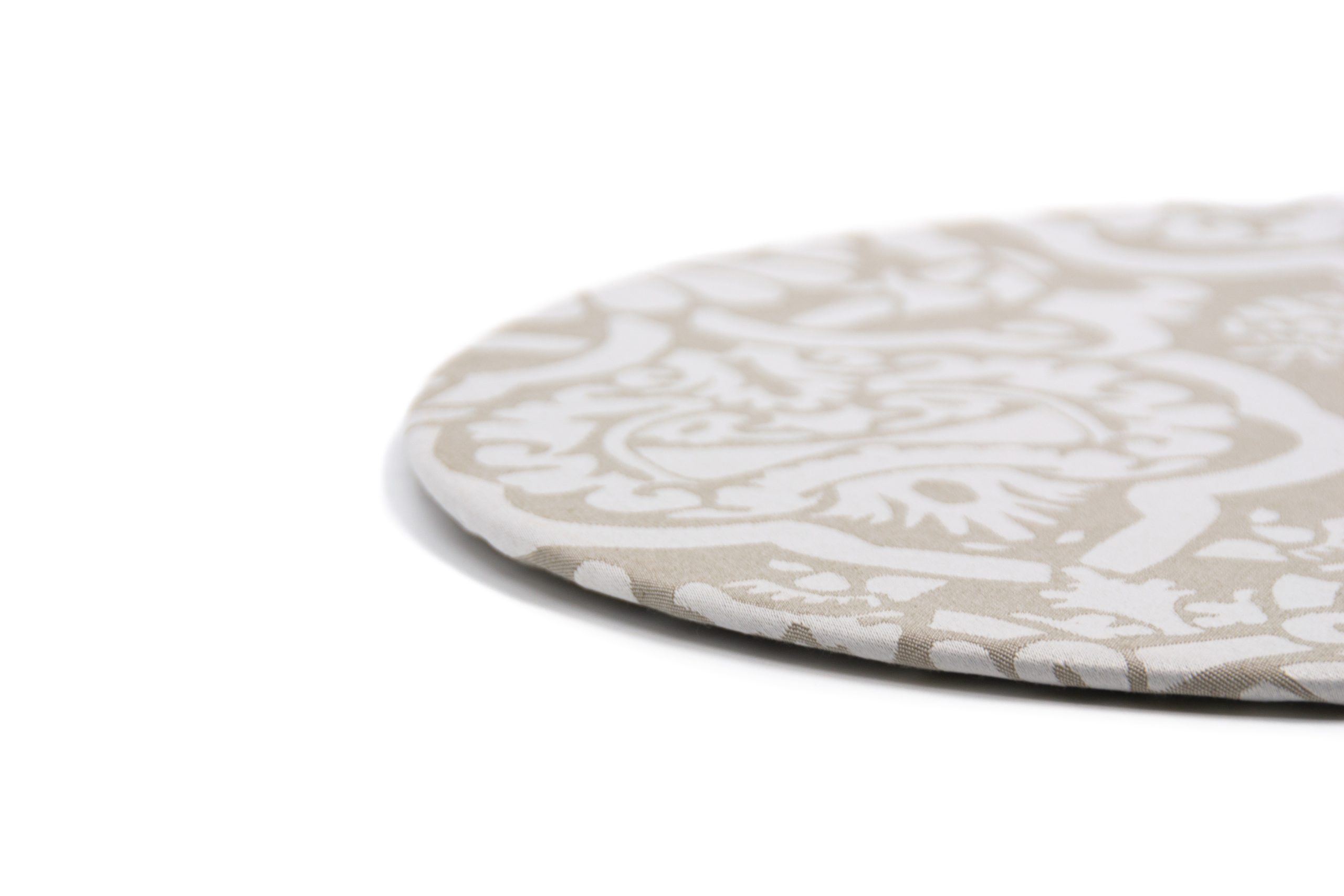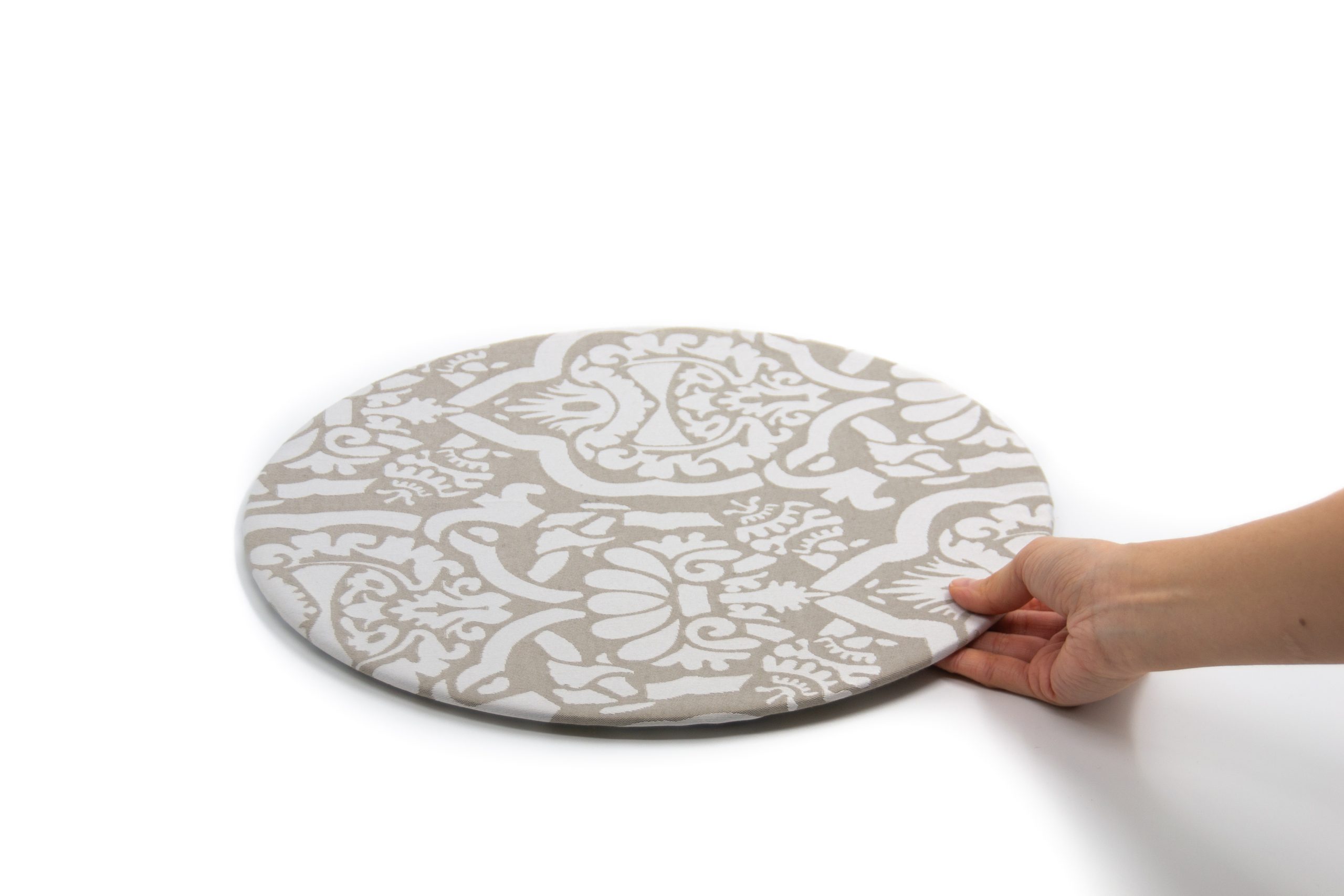 Base: madera Mdf. Funda de tela “Batea”: Jacquard 100% poliéster. Elástico. Medidas: 40 cm diámetro.