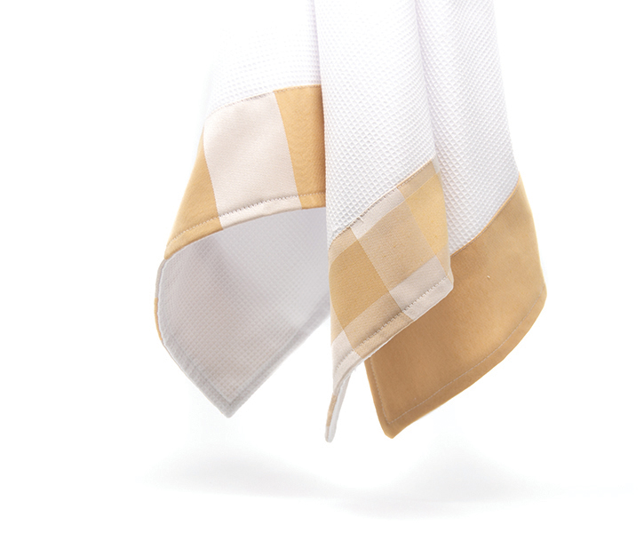 Trapo de tela tipo “waffle”: 50% algodón, 50% poliéster. Aplicación en tela “Batea”: Jacquard 100% poliéster. Listón para colgar: cinta palmita 100% algodón. Medias: 45 cm x 60 cm.
